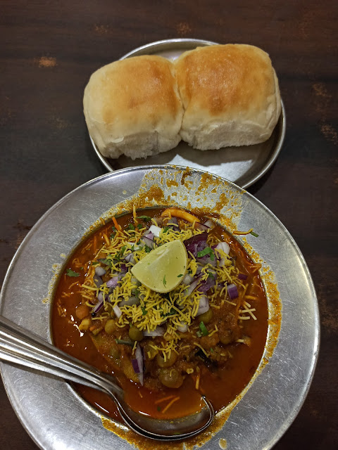 A small plate with a base of poha, a layer of boiled lentils, topped with chopped onions then green coriander and then sev. This plate is kept in a bigger plate with a deep base and then a spicy curry is poured over it. Scoop a spoonful of the mixture of the small plate, dip it in the curry and have it.