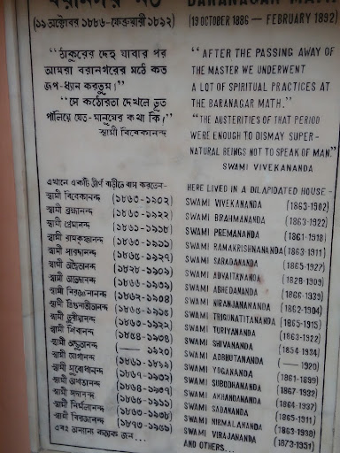 Read moreDivine place Baranagar Math (Baranagar Monastery) or Ramakrishna Math, Baranagar was the first monastery of Ramakrishna Order. In September 1886, after the death of Ramakrishna, when his devotees stopped funding, Swami Vivekananda (then known as Narendranath Datta) and other disciples of Ramakrishna decided to make a dilapidated house at Baranagar their new math.The house crumbled to dust in 1897. In 1973 Vivekananda Math Samrakshan Samity was formed who attempted to preserve the area. In 2001, the possession was handed over to Belur Math authority, who soon-after declared it as one of their official branch. The restoration and development work of the area is still going on. After the death of Ramakrishna on 16 August 1886, his devotees and admirers stopped funding. Many of his disciples showed inclination to return home and live Grihastha(family-oriented) life. The monastic disciples led by young Narendranath Datta understood the necessity to find out a new shelter. Narendranath and others decided to make dilapidated house at Baranagar the new math(monastery) for remaining disciples.The house belonged to a zaminder family of Taki, North 24 Parganas district. Surendra Nath Mitra, a devotee of Ramakrishna desired to pay the rent for the house.Narendranath and his guru bhais used to collect their daily food by "holy begging" (madhukari). The math became the first building of the Ramakrishna Math—the monastery of the monastic order of Ramakrishnab. Narendra later reminisced about the early days in...