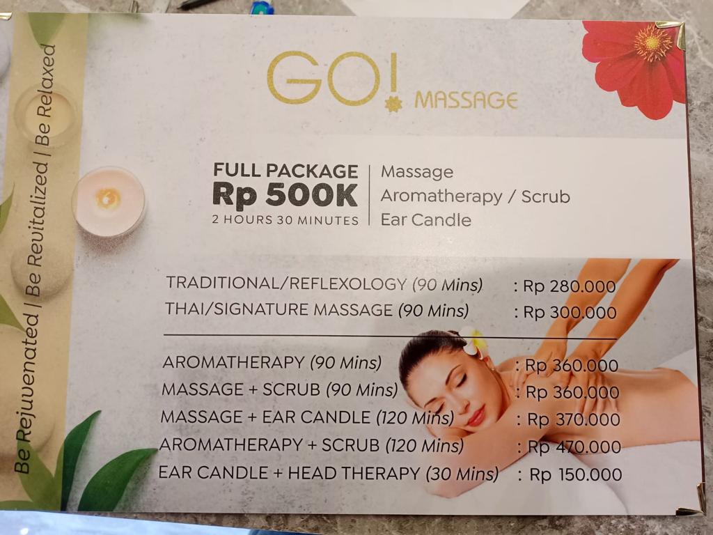 Read moreThe worst massage I’ve ever experienced. Our 1h massage costs 240000 rupiahs (not listed on price list). 1.5h massage costs 280000 rupiahs (listed on price list). We are more than willing to pay for the 1h massage as long as it is good. There were 3 of us (my friend, my husband and myself). My masseur touched me superficially even though I asked her to be a little harder. As for my friend, her masseur only massaged one of her leg. Our 1h session ended up to be only 45 min (my husband is a good time keeper). During the massage, I overheard an auntie commenting to her friends that their 2h massage seemed so short and the masseur didn’t massage her tummy. I believed they might have been shortchanged of their time too! The whole massage experience was unpleasant and a waste of my time. Visit at your own risk! (They refunded us 48000 rupiah per person after we complained (20% of what we had paid)). In my opinion, this place is not honest and I will not waste my time on an unsatisfactory massage irregardless...
