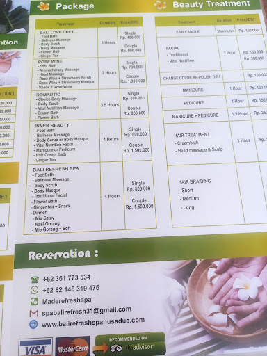 Read more"Overrated spa, uncomfortable experiences" The refresh spa located near the main gate of nusa dua, free pick up for nusa dua area's hotel, 5 minutes to the Grand hyatt. My families were greeted with cold drinks and cold hand towels, the cold drinks were good, but the hand towels seemed were not washed thoroughly for such a long time that their original white color turned to yellow gray and smelled disgustingly. The facilities in masage room were in average standard, however when I faced down on the massage bed, a mixed smell of humid and moldy made me very uncomfortable, the masage skills were in average level compare to the price of 250K for 1.5 hour full body masage. The most annoying thing was that we were told if we come back again and give high scores in the tripadvisor, we can get additional 20% discount. I will not recognize it as cheating, but I do not like such kind of promotional means. Finally I do not get 20% discount because I will not...
