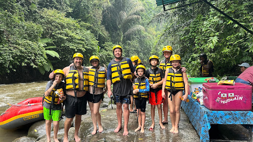Exciting rafting adventure through the Balinese jungle: The entire tour was organized very well. Our family was picked up directly at our hotel. At the rafting base there were changing rooms and it was possible to store our stuffs in a locker. Everybody got a life jacket, a helmet, and a paddle of course. We wore our wetsuits and aqua shoes for convenience, but you can easily do the tour in casual clothes - but you'll get wet completely in any way. Next we were driven to the starting location, where we had to descend about 10 minutes through the jungle down to the river. Before accessing the boats the guides  gave us some instructions how to act during the tour. The rafting itself is comparatively relaxing - you neither need any experience in rafting nor you have to be very sporty. The guides steered us safely along all obstacles and rapids. There was enough time to enjoy the awesome beauty of the pure wilderness: we saw some monkeys as well as some lizards. In the middle of the tour, we had a short break, where we could buy some affordable snacks and drinks. After about 2 hours we reached the destination, where we had to ascend back to the waiting vans which brought us back to the rafting base. There, we received free towels and could take a shower. It was possible to buy some photos and videos that were taken during the tour from the riverside. Finally, we were offered a very delicious buffet which was also included in the tour packet. Full and happy we were dropped off at our hotel later on.