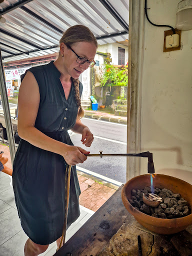 It was a lot of fun. I chose a more complex design pair of earrings, so I didn't do the cutting out myself. Had it been simpler, you would also do the cutting. But, since I was the only person there at that time, Wayan was happy to do the cutting for me. It took him a bit of time, so i could imagine it would have taken me all day if I had done it myself. I melted the silver, hammered it, rolled it thinner, heated it, rolled it again, drew the design, cleaned it, sanded it, and polished it. So not 100% made by me, but plenty involved. If you do something a little less complicated, you would 100% be doing it yourself. Any questions I asked were answered. They would show you what to do, then let you do it. Would do it again with Wayan, and do something simpler so that I can do the whole thing next time just to say I did it. Next trip to Bali, I will 100% go again. Thank you to Wayan and his employee (who I feel so bad I didn't get her name. She was great and took me through most of the process while Wayan was regretting agreeing to cut out my design 🤣) Terima kasih banyak atas pengalaman...