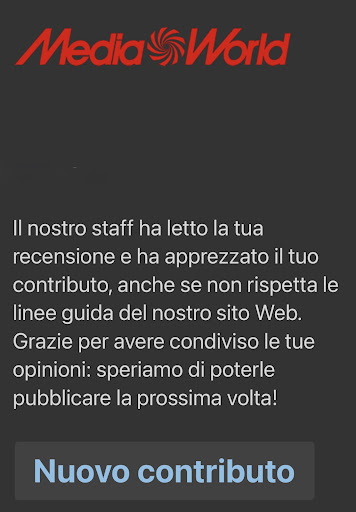 Morale: Il sito di mediaworld.it meriterebbe 2,5 stelle su 5 (non si smarrisce un’asciugatrice né si tarda nei rimborsi e quando si concorda una consegna si propongono 2-3 date in modo da trovarne una che vada bene anche al cliente), ma siccome la storia delle aziende la fanno le persone (Daniele Alessandro e Luisa) dò 5 stelle.