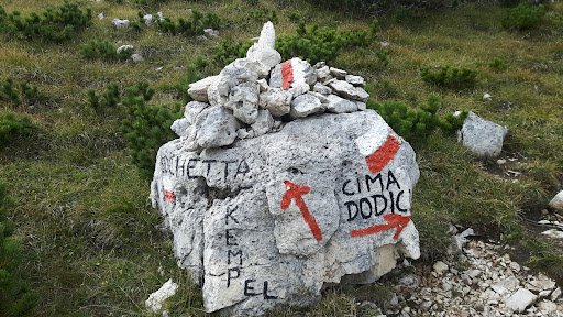 Raggiunta dai Larici la camminata diventa impegnativa (circa 3,5h). Noi siamo passati per Cima Larici e poi bocchetta Kempel. Il percorso è molto bello col bel tempo e molto esposto al sole per cui è meglio avere crema protettiva. Cima XII ha una forma piramidale molto caratteristica ed è la montagna più alta del vicentino (2336). Vicino ha le altre due montagne che le fanno compagnia sul podio, cima Trentin (2326) e più staccata cima Portule (2308). A chi fa Larici-Cima XII consiglio al ritorno di salire il Portule da bocchetta Kempel per poi tornare a Porta Renzola e tagliare giù raggiungendo la Eugenstrasse che arriva a Malga Larici. Questa combinazione con un buon passo...