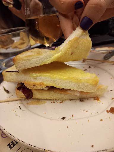 Il bun vegano era tristissimo, costava più di quelli normali ma l'hamburger era piccolissimo, inoltre nel menù erano segnate le zucchine ma dentro c'erano i pomodori secchi. Un'altra persona ha ordinato il club sandwich, ma era totalmente sproporzionato: negli strati esterni aveva solo maionese allo zafferano in quantità minime, mentre la carne e il cavolo erano presenti solo nello strato al centro in un unico punto, il resto era tutto pane (il pane usato tra l'altro era tipo il pancarré, neanche quello giusto). Il club sandwich dovrebbe avere ogni strato pieno, questo era veramente triste. Inoltre era stato chiesto prima di ordinare se il sandwich aveva le patatine accanto, ed era stato risposto di no, ma poi ci è arrivato con le doritos accanto, segno di una comunicazione scarsa tra sala e cucina. I prodotti sono anche di buona qualità, ma metterne così poco in un sandwich che ha più pane che condimento, a quasi 13 euro, è veramente una ladrata. Anche la pinsa con la nduja era veramente scarsa.