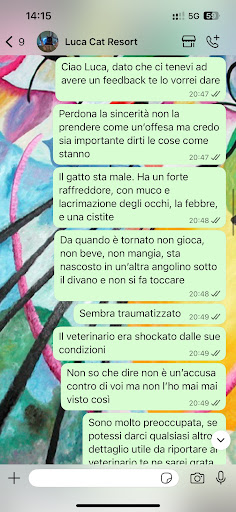 Ma iniziamo dal principio: il gatto ci viene riconsegnato che pesava 2kg in meno, senza voce e debole, e il signor Luca tutto quello che ha da dire è “proprio oggi ha fatto un solo starnuto potrebbe avere un leggero raffreddore, fino a ieri era perfetto”. Perso peso e voce in mezza giornata, dev’essere un nuovo record. Negare l’evidenza. Lo portiamo subito dal veterinario ovviamente ed il gatto ha raffreddore, febbre, congiuntivite, cistite, e chi più ne ha più ne metta, ci ha messo mesi a tornare normale. E qui non si tratta di gatti a contatto con altri gatti che possono incorrere in qualche contagio, si tratta di mentire in faccia ai proprietari, di dire di avere un veterinario on call ed evidentemente non usufruirne, di far pagare prezzi da resort di lusso e poi trattare i gatti in maniera palesemente inadeguata. E di MENTIRE, minimizzare, pur di “salvare “ la faccia, sai perché va su Mediaset, quello si che è importante! E mi unisco a tutti gli altri commenti simili che ho visto, perché se ce ne sono diversi è una prova, non siamo tutti pazzi. MAI PIÙ’.