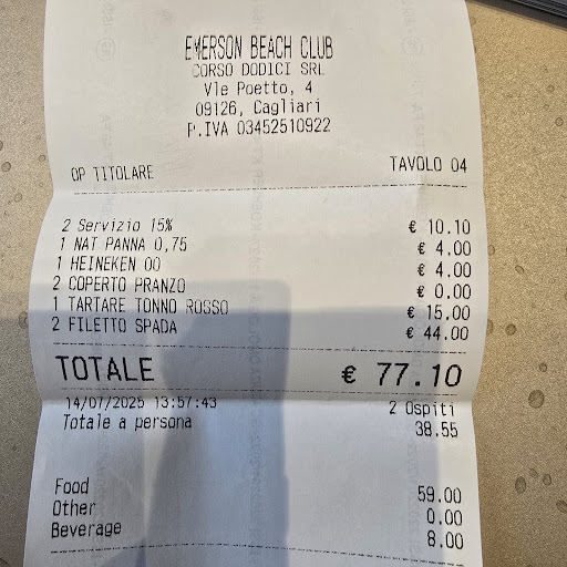 We have visited this Beach Club two times in July 2025. It is divided into 2 parts: 1:The Beach Club with access to the Beach 2: The Restaurant So I want to do a different Rating for both of it. The Beach Club is good looking. The Beach is sandy and clean. The Sunbeds are quite new and good looking. That is valid for the Sunshades as well. To rent it is quite expensive. The price is different between half Day and full day. Even the price for each Row is different. July, 14th we have been there from about 9:30-13:00 and needed to pay 30 € for the 5th row for two people. Then we got guided to our Sunbeds. The area has a LIFEGUARD. The safe water area is limited with a rope. Flags are showing if swimming is allowed or not. For all of this I would rate it with 4 Stars. Now the part about the Restaurant. It is good looking with white colour. Of course you will get served. The Menu is readable with help of the QR-CODE. The choice is quite limited. We have asked the waitress if the Tuna TARTARE is fresh what she confirmed. So we have ordered it (15 €). For Main we ordered Swordfish ( Filetto Spada, 22 €). We also have had one nonalcoholic Beer ( 4€) and one bottle of Mineralwater (0,75 l= 4€). Then the Tuna TARTARE was served. At first glance we saw that the Tuna TARTARE wasn't fresh. It got a Treatment with Soja sauce and Vinegar to keep it longer fresh. So it wasn't fresh. The colour was grey. So the information from the waitress was wrong. The Swordfish was prepared dry. The portion was small. Coperto wasn't charged. But 15% (!!) Service Charge was added. Finally I needed to pay 77,10 €. It wasn't worth the money at all. So my separate rating for the Restaurant would be one Star. Because of this the final Rating of the Beach Club is 2 Stars.