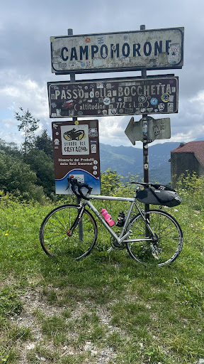 Une conquista! Da Alessandra per arrivare a Genova abbiamo deciso di pedalare su strada secondarie fino ad arrivare a Gavi dove, dopo un buon caffè, inizia la vera salita che si innalza con pendenze anche importanti fino alla cima del passo per poi scollinare in una discesa vertiginosa fino al paese di Campomorone e così a Genova. Davvero bello il panorama che lascia senza fiato nel vero senso del termine una volta arrivati in cima. Da qui si vede il mare! C'è anche una panchina gigante dalla quelle poter godere di tanta bellezza. Monumento commemorativo ai grandi ciclisti della storia di questo sport pieno di gioia e sacrificio, tra questi anche Fausto Coppi. Il passo della Bocchetta è un valico dell'Appennino ligure posto a quota 772 m s.l.m. lungo la strada che collega Campomorone con Voltaggio ovvero la val Polcevera con la Val Lemme, denominata strada provinciale 5 della Bocchetta nella tratta genovese e strada provinciale 160 della Val Lemme nella tratta alessandrina.