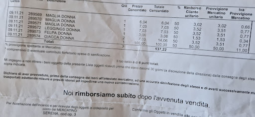 Read more"Noi rimborsiamo subito dopo l'avvenuta vendita" recitava la ricevuta che ci è stata rilasciata alla consegna di alcuni capi da vendere, così non è stato... Abbiamo consegnato 7 capi, del valore di 137€, il cui incasso avremmo dovuto dividere equamente con il mercatino dopo la vendita. Dopo circa un mese abbiamo ricevuto una mail che ci comunicava l'avvenuta vendita di un capo, del valore di pochi euro: "bene" ci siamo detti, "quando venderanno i più costosi contatteremo il mercatino per incassare il dovuto". Dopo diversi mesi, non avendo più ricevuto nessuna comunicazione, e vedendo che anche sulla loro app i capi risultavano invenduti, siamo andati al mercatino per ritirare i capi e... scopriamo invece che erano stati tutti venduti, per altro subito entro un mese dalla nostra consegna. La signora, probabilmente la responsabile del mercatino, in modo sbrigativo ci spiega che loro hanno mandato le mail dopo aver venduto i capi (noi però ne abbiamo ricevuta una sola) e che, essendo passato più di un anno, nulla ci è dovuto (!!). Personalmente ritengo tutto molto scorretto, la sensazione è che giochino a proprio vantaggio su questi aspetti, per non dividere gli incassi.....