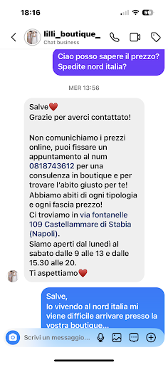 Anche se la boutique si trovava lontano,seguendo le pagine social con tantissimo entusiasmo prendo appuntamento.Arrivando sul posto, trovo già una fila di persone in attesa, chiedo la conferma se la boutique 🫣😱 è giusta, perché vedendo le vetrine ho pensato di aver sbagliato la via o posto.Armandomi di pazienza ,non mi faccio scoraggiare e attendo (appuntamento per le 15:30... apertura di negozio alle 16). Al apertura capisco che appuntamento è solo una formalità,che non sarà rispettata una volta che si entra,un caos totale. Arriva il mio momento,una commessa con aria scocciata,mi coglie di sorpresa chiedendomi di mostrare abiti che mi possono interessare direttamente dalla loro pagina social. Ovviamente perdo tempo per trovare.Una volta ricevendo indicazioni la commessa scompare nel deposito. Mi guardo intorno per capire se posso vedere qualcosa internamente esposto....un negozio vecchio,con esposizione quasi inesistente,un podi abiti ammucchiati,che non si riesce vedere, perché dentro un spazio piccolissimo, c'è una marea di persone.Dopo 15min d'attesa finalmente arriva la commessa con 6 abiti,tre scarto, restanti vado a misurare. Camerino minuscolo sembra un sgabuzzino,le porte affacciano sul entrata dove sono persone in attesa e la strada. Da premettere che ho misurato abiti di alto livello,che sono stati maneggiati con poca cura. Catena di montaggio...in 20 Min ho misurato 10 abiti,con due commesse che entravano e uscivano, dandomi fretta e ogni volta sempre più infastiditi. Pur di trovare abito non bado nemmeno il fatto che mi vedono tutti,anche dalla strada ad ogni loro uscita - entrata. Gli chiedo anche il perché su questa scelta di trattare la clientela e appuntamenti in questo modo caotico, poco chiaro,senza una esposizione e possibilità di vedere almeno qualche linea di collezioni prima. La risposta è che loro hanno un deposito pieno di abiti di ogni genere,e loro clientela arriva già con indicazioni presi dal social (forse è giusto precisare questo quando si prende appuntamento,ormatevi di foto!!! perché qui non vedrai nulla e ti si da poco tempo). Trovo un abito che mi piace,e la commessa mi dice il costo del abito evidenziando che tutti aggiusti sartoriali hanno un costo extra e bisogna prendere appuntamento ,mi chiede di decidere immediatamente, perché essendoci unico e vedendomi indossare(fila in attesa😂)già c'è una signora interessata per provarlo. Chiedo le 2min per dare ossigeno al cervello,e come esco capisco che per la stima verso me stessa non acquisto qua. Comunico la decisione con eduzione salutando,ma non ricevo ovviamente la stessa cordialità. Concludo che siete il top sui social ma un flop e una delusione in realtà.Ho preso il mio abito dal atelier dove ,prendendo appuntamento avevo il tempo e la persona dedicata solo a me,dove mi hanno ascoltato,pagando solo il costo del abito, le modifiche sartoriali erano gratuiti e sempre sul appuntamento singolare. Le recensioni servono per crescere...