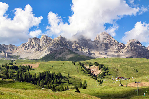 Passo San Pellegrino is a high mountain pass in the heart of the Italian Dolomites, sitting at an altitude of 1,918 meters on the border of the Trentino and Belluno provinces. The pass connects the resort town of Moena in Val di Fassa with Falcade in the Belluno province, traversed by the well-maintained SS346 road. Renowned for its breathtaking alpine scenery, the pass serves as a gateway to the expansive Trevalli ski area, with slopes rising up to Col Margherita at 2,513 meters, offering over 60 kilometers of groomed pistes and panoramic views of the surrounding Dolomitic peaks such as Marmolada...