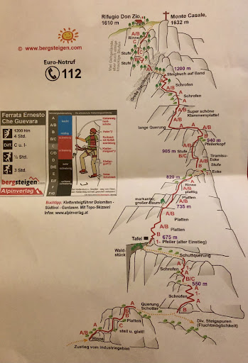 Ferrata che si snoda sul monte Casale. Una stupenda ferrata, un po' datata, che nella sua singolarità non è difficile ma nell'insieme e avvicinamento è molto impegnativa per la lunghezza. L'avvicinamento comprende un'altra breve ferrata che si soda sopra la cava di Pietramurata (Sarche) dove c'è un comodo parcheggio. Da lì la salita ben segnalata che conduce all'attacco della via attrezzata. La ferrata è molto bella e abbastanza facile, il pericolo più grande sono i sassi volanti che possono arrivare da sopra smossi da animali o altri ferratisti... In genere però non è molto frequentata... Quando si arriva sulla cima del Monte Casale è d'obbligo fermarsi a mangiare al rifugio gestito da volontari e gustarsi ogni singolo boccone perché la parte dura non è ancora arrivata. La discesa per tornare a completare l'anello sarà molto lunga e in alcuni tratti non ben segnalata ( utile potete utilizzare l'app. Outdoor Trentino che vi segnala la via, vi da il sentiero in tempo reale e tutte le indicazioni dei bivi e svolte, molto utile e comoda). Attenzione nel periodo estivo alla gestione dell'acqua poiché non ci sono fonti lungo la via e il sole batte forte. Per il resto assieme alla Pisetta penso siano le ferrate che offrono più emozioni.(la Pisetta per la difficoltà, la Che Guevara per la lunghezza). La soddisfazione di portarle a termine, avendo la possibilità di ammirare il panorama, è qualcosa di straordinario. Prendendola comoda, compreso il pranzo al rifugio, per l'intero giro abbiamo impiegato poco meno di 12 ore... Ma anche accelerando il tempo da mettere in preventivo è quello, più che altro per la discesa che spero abbiamo sistemato i sentieri che erano inesistenti. Consigliata e straconsigliata. Dislivello +1450 m di salita e - 1450 di, discesa per un bel 3900 metri di dislivello da...