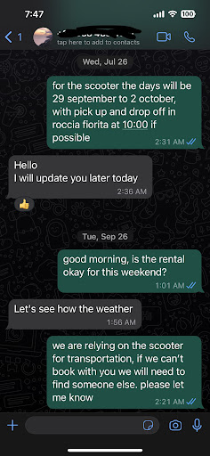 Second of all, Salvatore is the best in his business. He always reserves my favorite Vespa for me, delivers it to my villa, and is a real pleasure to work with. He gives the best prices, and if there were to be anything wrong with the scooter, he will come to you to trade, fix, whatever. He is the best. We have been renting from him for over 10 years, and trust him completely. One time we had to turn in the scooters early and he gave us a refund without a problem. I recommend him and his company with 5...
