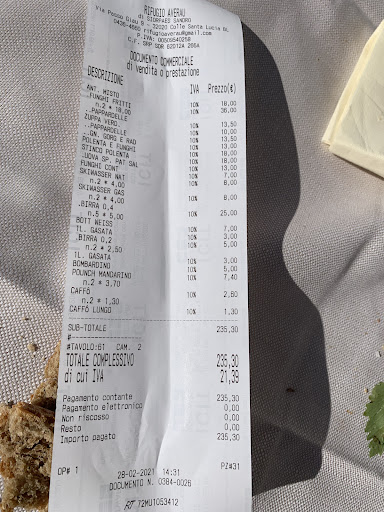 Prenotato una settimana prima per pranzare fuori . All’arrivo , ci fanno sedere su l’unico tavolo senza vista , in ombra , al di fuori della terrazza adibita per il pranzo, esposto al freddo, con panche piene di schegge di legno. Abbiamo chiesto al gestore di farci spostare , ci ha risposto che c’è chi prenota una settimana prima per poter mangiare all’aperto; ricordandogli che siamo tra quelli, ci risponde che non ha altri tavoli dove farci sedere . A tal punto , di nostra iniziativa , dopo 30 minuti al freddo, beccandoci 1 scheggia sulla mano, un piumino bucato da una sulla panca e la mia fidanzata una sulla gamba , ci spostiamo su uno dei tanti tavoli liberi, sostituiamo il n* del tavolo e iniziamo ad ordinare per mangiare . Faccio inoltre presente che , nel mentre , arriva una famiglia che non aveva prenotato ma era conosciuta al gestore , chiede di poter mangiare e magicamente il tavolo che era prenotato da terzi, diventa l’oro con la promessa di liberarlo entro le 13:30, sono rimasti ben oltre le 14:30, orario in cui noi ci siamo alzati per pagare . Tutto abbastanza buono tranne la polenta e funghi dove la polenta era liquida a tal punto che serviva il cucchiaio per mangiarla, conto nella norma . Per quanto riguarda il servizio che abbiamo ricevuto e come siamo stati trattati, personalmente non ci tornerò mai più, ci sono tanti rifugi dove andare, dove si mangia bene e/o meglio ma dove vieni trattato da cliente e...