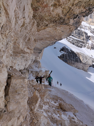 Description: The Bus de Tofana is a large, natural rock arch located in the Dolomites, Italy. It is situated in the Tofana mountain group, near the town of Cortina d'Ampezzo. The arch has a span of approximately 30 meters (98 feet) and a height of about 25 meters (82 feet).