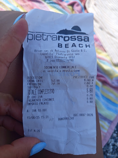 Read moreUn luogo che definirei "Catartico". Sono ben due volte che torniamo in questo luogo meraviglioso. Abbiamo trovato innanzitutto in maniera molto esplicita e per me dettaglio fondamentale "l'educazione". Il proprietario dalla maglia rossa è una persona squisita, sempre con il sorriso che ti accoglie nel suo spazio ripeto con educazione, dettaglio che oggi giorno è andato a perdersi nell'oscurità. È una persona che ha la capacità di tener sotto controllo uno stabilimento intero per permettere ai suoi clienti ore di totale serenità e beatitudine. Nello stabilimento Pietra Rossa riesci a trovare la pausa della coscienza, un sopore unico che permette di rilassarti al meglio e in automatico ti invita a tornare anche il giorno dopo. Entrambi i ragazzi sia nella postazione bar e postazione "salvataggio" sono persone educatissime che rispettano il "lavoro". Sono ragazzi giovani che hanno grande potenziale. Che dire di più, se avrò possibilità di tornare nei prossimi anni, non ci penserò due volte. Il mio posto sarà Pietra Rossa, mi sono sentito a casa, e l'educazione reciproca che c'è stata è stato quel tocco aggiuntivo che ha reso...