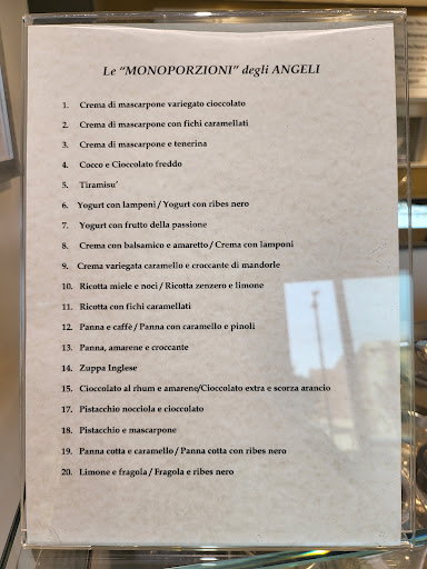 Andate Un bacio chiedete Abbondante lo avrete. Le vaschette pienate Da commesse fatate Un grande alchimista Fa' lunga la lista Fresco e gelato Va subito gustato Una scorta in freezer è corretta All'uopo usata Anche con fretta Mettendo in microonde la vaschetta Prima un poco apri il coperchio Poi a gradimento sarai soverchio Se un chilo o più voi prendete I cornini chiedete e con un sorriso li avrete Son fantastici cucchiaini Non li usano solo i bambini Mentre mangi lor si inzuppano Tu li mordi due tre volte fungono Per i piccoli certamente Li ripieni dolcemente Loro hanno un cornettino Lo mangiano pianino La cialda vai tranquilla Fatta apposta che poi sguilla Un ciuffo di panna tu vuoi fare Certo MEGLIO prenotare Tu li chiami dai l'orario Sanno bene l'abbecedario Al minuto i cinque tranquilla Paghi vai nessuna squilla Ivi vado aliquando Ma sto certamente intensificando Ci vediamo lor Signore Pilucchiamo con ardore Una leccata ad ogni gusto Nel cornino il gusto giusto. Li conosco da parecchio Dai retta a un vecchio Un elisir come il lor gelato Io spesso ho consumato. Grazie ANGELI A PRESTO TORNO IO HO...