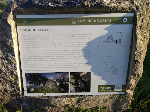 Il Corvos è un nuraghe di tipo complesso composto da una torre principale e da un bastione con due torri secondarie. Il monumento presenta la peculiarità di essere stato restaurato in antico a seguito del cedimento delle strutture murarie superiori o per la necessità di realizzare un ulteriore piano. La torre principale, quella meglio conservata, ha pianta circolare (diam. m 13,60. alt. m 8,20) ed è costruita alla base con blocchi di calcare di grandi dimensioni appena sbozzati. ad essi, nel corso del restauro, sono stati sovrapposti conci di trachite scura ben lavorati. Il restauro non appare uniforme: nel lato NE, probabilmente interessato dal cedimento delle strutture, interessa anche i filari calcarei sottostanti, mentre nei restanti lati si imposta con regolarità sulla struttura originaria in calcare. L'ingresso alla torre principale, orientato a SE (alt. m 0,85), è coperto da un architrave con due spiragli di scarico che presenta, sulla faccia interna, una risega. Una vistosa lesione interessa oggi lo stipite s. e ha causato il posizionamento di una pietra di sostegno che ostruisce parte dell'ingresso. L'andito restrostante (lungh. m 4,80. alt. m 2,25) presenta a s. la nicchia d'andito (m 1,70 x 1,10 x 1,05 h) e a d. l'ingresso della scala (m 1,70 x 3,20 h ) oggi ingombra da macerie. Percorrendo quest'ultima si raggiunge la sommità della torre dove si conservano scarsi resti della camera superiore. Il corridoio conduce alla camera a "tholos", con pianta leggermente schiacciata (m 4,30 x 4,50. alt. m 5,30) edificata con pietre di dimensioni decrescenti, poste in opera con cura. Sul profilo del vano si aprono, con disposizione a croce, tre nicchie: i vani di sinistra e centrale hanno pianta semicircolare, quello sulla d. si sviluppa a "L". Il bastione (largh. m 24. spess. m 6) inglobava due torri oggi appena leggibili sul terreno (diam. m 7,50 e m 9). Le cortine murarie del corpo aggiunto affiorano appena ad eccezione del lato a sud-ovest, prossimo alla scarpata che scende al fiume Mannu, dove le strutture si ergono per un'altezza residua di circa 2 m su tre filari di pietre. ...