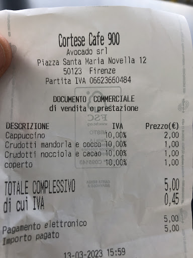 Prices are good but the cafe cut 1 € coperto when you are paying your bill. When you think to pay 1.20 € for an espresso or 2 € for a cappuccino but the real prices are 2,20 € or 3 €. I never like that «coperto» thing, it is very tricky. I didnt get any information about it. I just realized when I was paying. If I knew it before, I didn’t prefer to sit that cafe. The cappuccino was normal, was not in the best in the town like they claim. I also didnt like the pastries I tried.