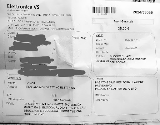 Read moreHo portato a riparare da voi, poco fa un monopattino che aveva i collegamenti elettrici in tilt+ il parafango di dietro si era smontato e andava riordinato una vite contabile, solo con un apposito utensile che hanno dovuto ordinare. Poi il buzzer prima della riparazione funzionava a tratti, cioè quando andando sulle buche faceva contatto a tratti, ma al 100%, e praticamente in tre settimane mi è stato riparato tutto, anche se la valvola della ruota posteriore è stata lasciata piegata in seguito allo smontaggio della ruota(me l’ha risistemata e in seguito rigonfiata la ruota un altro meccanico vicino a casa mia), e poi il buzzer non funzionava più, ma comunque in 3/4 giorni in più me l’hanno sostituito allo stesso prezzo, quindi ottimo, anche se è un po’ più debole rispetto al precedente.. però sempre meglio di niente, e poi i pedoni lo sentono quindi va bene in pratica. L’importo pagato alla fine è stato il massimo possibile prevedibile dal foglio...
