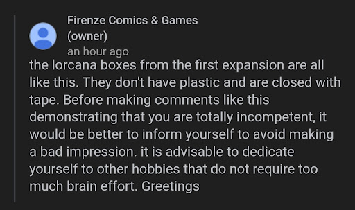 Read moreThis is how the owner writes to his customers. It is totally unacceptable for a company to talk like this even if the customer is wrong. It's unprofessional and this kind of behavior is for the streets or for YouTube comments and not for a business. After I was wrong about the box since i'm new to the hobby, I would've changed my review gladly but now i'm just left feeling disapointed that I supported this business and bought anything here. Also him saying bellow that he wasn't rude at all while he is definitely rude while offending a customer shows just how oblivious he is about his behaviour,...