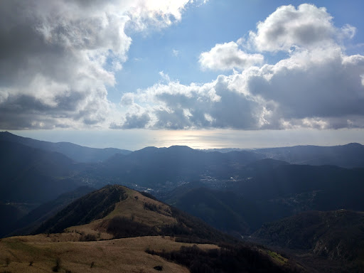 Monte Alpesisa (989 m) – ...Partenza dal Colle di Creto (604 m), segnavia Alta Via dei Monti Liguri. Si segue un sentiero che passa accanto alla chiesa, e prosegue verso est, sul versante sud del displuviale appenninico, tagliando la quota 712. Dopo una selletta si passa, per breve tratto, sul versante nord del displuviale stesso, poi nuovamente su quello sud, tagliando sotto il monte Cornua. Attraverso alcuni prati si giunge poi alla Gola di Sisa (729 m – Ore 0,40). Da qui si sale per ripidi pendii erbosi per il versante ovest. Ore 0,45.........Isolata cima erbosa, foggiata a tumulo, che si eleva sullo spartiacque principale a est dei Piani di Creto, dominando il lago di Val Noci. Il suo caratteristico profilo trapezioidale è ben visibile da Genova; dagli altri lati la montagna tende ad assumere forma conica. La vetta è costituita da una lunga e rettilinea cresta pianeggiante, relativamente esile, lunga circa 200 m; vi sorge una singolare croce ricavata da balestre di autobus. Punto panoramico sulla Valle del Bisagno, sulla città di Genova e sulla riviera di ponente. Sui suoi fianchi crescono: Narciso, Mughetto, Miosotide Nano, Centaurea montana, Orchidee. Monte...