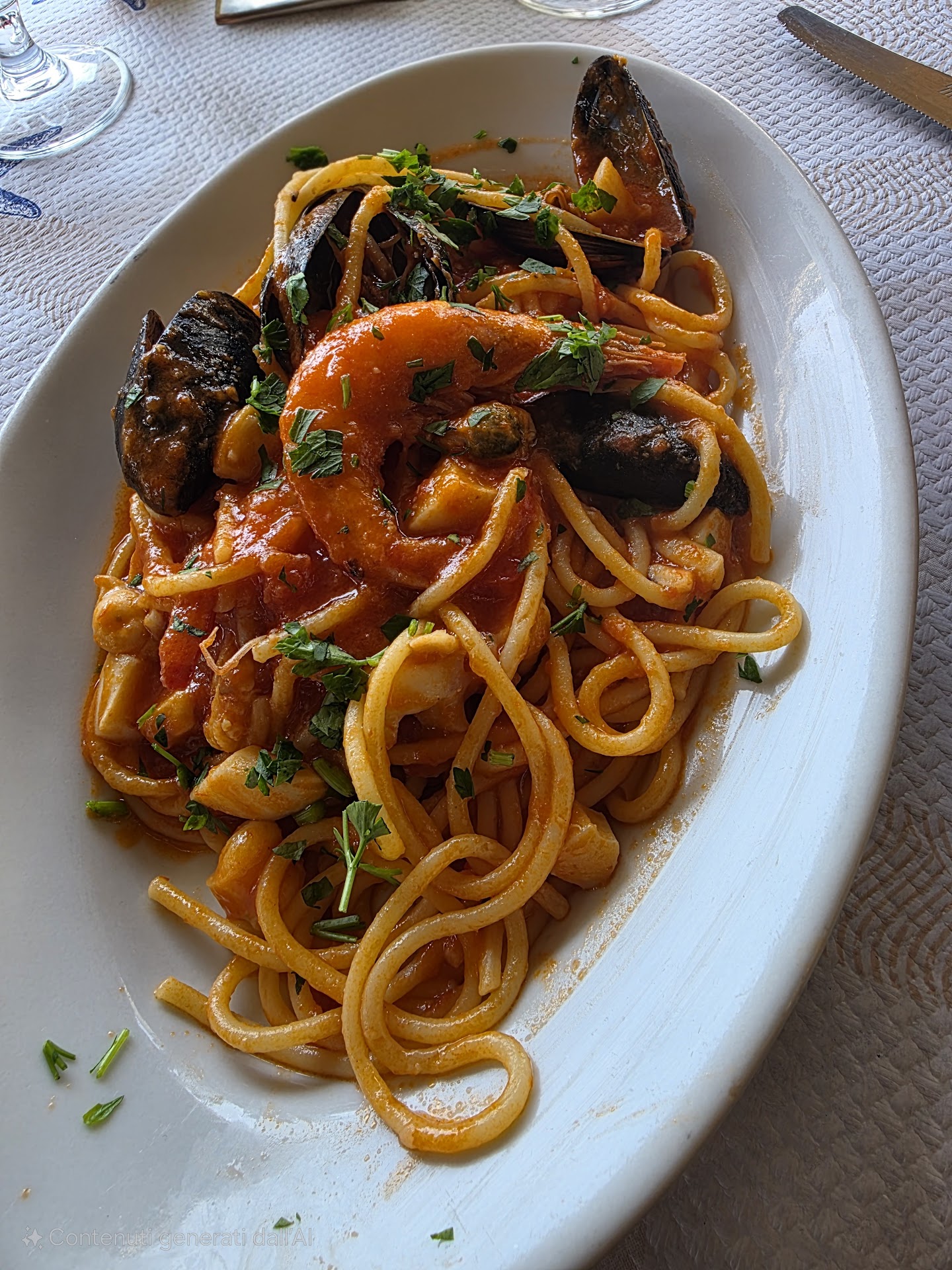 Read moreLocation molto carina, la piu bella a Ladispoli. Una terrazza a vetri sul mare, purtroppo con tavoli di legno da trattoria e ancor peggio con tovaglia e tovaglioli di carta decorati in stile anni 90. Poi vedendo sul menu che quasi tutte le voci avevano l'asterisco di congelato, chiediamo a un cameriere quali siano i piatti di pesce fresco per ordinarli. Lui chiede in cucina e ci conferma che tranne alcune pochissime cose senza asterisco, il resto è quasi tutto congelato. Ho terminato la cena, abbiamo pagato un bel conto salato, ma ho fatto una brutta figura con le persone che avevo portato li a cena, perche anche loro sentendo il cameriere, credevano fosse quasi tutto congelato... Infatti ci siamo domandati perche abbia prezzi cosi alti, come un vero ristorante di pesce fresco, se poi è piu uno stabilimento con il cibo quasi tutto congelato. Ora ho capito perche molti di quelli che avevamo intorno erano andati li a mangiare la pizza... anche perche per il pesce ha prezzi alti da ristorante, ma hai tovaglia e tovaglioli in carta da pizzeria economica e tenute ferme da mollette di plastica, quelle per stendere i panni. Consiglio di modernizzare un po l'arredamento della sala, perche poco elegante e un po vetusto, di rifornire il ristorante di pesce fresco, crudi e pescato locale. Camerieri cordiali e gentilissimi. Cibo in generale buono e ben cucinato, ma nulla di freschissimo e da ricordare. Per ora per questo problema del pesce congelato do...