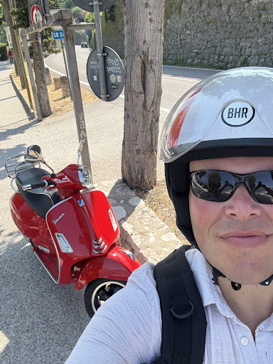 Wir sind per Onlinesuche auf diesen Vespa-Verlei aufmerksam geworden. Wir können die positiven Bewertungen nur bestätigen!! Sehr freundlicher und kompetenter Service! Vespas im tadellosen Zustand (schauen aus wie neu!) Roller wird im Zweifel auf das"Benutzergewicht" angepasst. Kurze und gute Einweisung. Saubere Helme ohne Eckelfaktor für kleine Birnen bis zu Quadratschädeln wie meiner. (Jeder Nutzer bekommt eine Art Kopfhaube - damit der Helm innen sauber bleibt - super hygienische Sache die man unter den Helm weder spürt noch sieht!) Die Roller sind 125iger dürfen aber in Italien auch mit dem "B"-Führerschein bzw. Dem "3er" gefahren werden. Also keine 45kmh Bremse. Sondern locker über 80 Sachen. Macht man zwar eh kaum. Hier in Bella Italia ist Cruisen und die Landschaft genießen einfach zu schön um daran vorbei zu rasen! Wir hatten ein wunderbaren Urlaubstag mit fantastischen Ausblicken auf zwei Passstraßen unterhalb des Monte Baldo und abseits der Gardisana. (Weniger Verkehr!) Parkplätze sind eher unwahrscheinlich und nur mit ganz viel Glück direkt neben dem Verleih frei (Wir hatten es...waren aber auch schon um 8.30 Uhr da)...ansonsten 4 Minuten Fußweg...ca. 350m oberhalb gibt es ein paar kostenlose oder dann auch kostenpflichtige Parkplätze. Die Roller sollte man per Termin bichen. Wir sind einen Tag zuvor hingefahren und haben für den nächsten Tag gebucht. Bei spontanen Aktionen steht man evtl. vor leerem Hof. Verständlich! Bei der Qualität ist man halt beliebt! Schöne Grüße aus Deutschland und Danke nochmals für das tolle Erlebnis! Jasmin, Nadine...