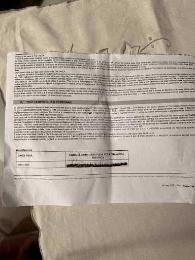 Passando invece alla parte del servizio. Ricevute le informazioni che ho chiesto mi vengono fornite con il foglio che allego in foto, pieno di numeri personali di persone a me sconosciute e con la firma autografa di un altro cliente (che ho nascosto per correttezza). Ma la privacy? Il trattamento dei dati personali? Ma dove siamo al mercato? O peggio in un SUK? Ma un volantino professionale? Premetto che io ero andata a richiedere il passaggio di 2 schede sim a #tim, il passaggio di una linea casa e l’acquisto di #timvison COMPLETO. Non 20 secondo di perdita di tempo di un maleducato ignorante che a quanto pare è quello che si meritano come cliente in questo punto. Allibita e indignata #tim se non si fanno dei corsi per stare al pubblico e saper gestire le persone si va a fare un...