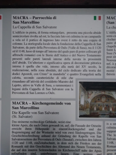 Read moreLa cappella di San Salvatore appena fuori del paese Macra, un gioiellino, ristrutturata da poco. Le chiavi per visitarla sono in comune, ci sono le istruzioni su una finestra. Dalla finestra ci si sporge per vedere l' interno e si capisce già la sua bellezza e i dipinti ristrutturati. Ben tenuta, c'è un grande prato di fianco dove si può fare pic nic ovviamente lasciando tutto pulito. Non ci sono bagni. Il fiume Maira passa di fianco ma la cappella è in alto...