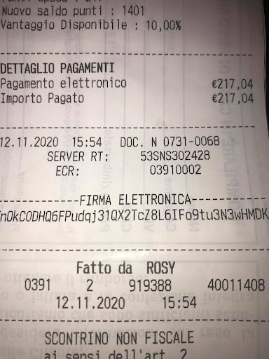 Read moreSalve. Oggi,12.11.2020 alle ore 15:54 sono venuta insieme a mio marito nel vostro punto vendita per degli acquisti,tutto andato bene finchè non siamo arrivati alla cassa e abbiamo dovuto pagare...c'era la "signora" Rosy,e uso le virgolette perchè la sua gentilezza non esisteva! Appena abbiamo messo i prodotti su,ha iniziato a buttarli in una maniera inspiegabile e molto maleducata! Abbiamo comprato un goniometro di ferro che quasi mi arrivava sulle mani! Sono una donna incinta e non avevo voglia di litigare però siamo sempre li da voi,clienti abituali ormai da 2 anni,ci siamo sempre trovati bene tranne oggi. Se la signora non e' capace di fare il suo lavoro ed essere gentile,può benissimo fare dell'altro. Non voglio neanche immaginare il comportamento che ha poi avuto verso 2 anziani dopo di noi. Vi allego anche la foto dello scontrino,dove per una spesa di ben 217,04 euro , devi essere trattato male! Spero non succeda più,anche perchè la prossima volta non stiamo più...