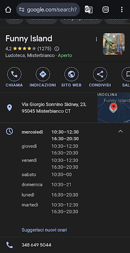 Rispondo alla prima risposta al paragrafo di cui sopra in data odierna e allego foto degli orari. Come si può vedere dallo screenshot di oggi allegato, su Google gli orari mattutini di oggi sono 10:30-12:30, come per il resto della settimana. Ribasdisco, Io e mia figlia siamo arrivati alle 11:30 e una signora mi ha detto in maniera anche abbastanza diretta e scocciata che "no, la mattina sooooolo per informazioni". Una dicitura che si potrebbe tranquillamente scrivere accanto agli orari della mattina. Io continuo a consigliare di toglierli direttamente. Ricevere una risposta alla prima recensione dove mi si scrive che gli orari pubblicati sono giusti e basta, zittendomi e facendo credere che mi inventi le cose purtroppo non lo trovo giusto, confermando lo spirito non del tutto leale della gestione. Vorrei abbassare a 3 stelle ma per...