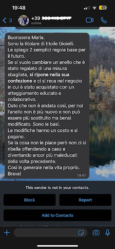 In questo negozio, la titolare (che non ho mai incontrato) si permette di utilizzare il vostro numero di telefono (lasciato al negozio per contattarvi quando il prodotto è pronto) per mandarvi dei messaggi scandalosi in privato e parlarvi con una superiorità, con la quale non ci si deve permettere a parlare con nessuno, sopratutto non con i suoi clienti. Sono arrivata in questo negozio assolutamente per sbaglio, dopo che il mio moroso ha deciso di regalarmi un anello comprato da loro. C'è tanto, ma poco da dire: professionalità scarsissima, comunicazione di informazioni mancata e zero rispetto per i clienti. In tutto questo, meno male che ho almeno questa foto del suo messaggio whatsapp come prova, che altrimenti la gente non mi vuole credere che esiste un livello di maleducazione, arroganza e superiorità di questo genere nel pieno centro della loro bellissima città. Auguro a tutti di lasciare i vostri soldi a chiunque ma non a loro, che altrimenti rischiate di rovinare dei regali per i vostri cari e delle belle emozioni come purtroppo, questo negozio ha rovinato a me e al mio moroso.