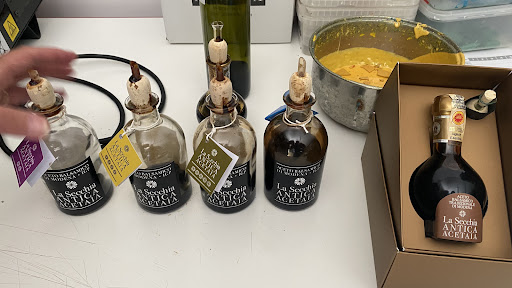 Eindelijk eens een producent die leeft voor zijn artisanaal en puur product. Geen toevoegingen, enkel het pure spul! We zijn hier zonder afspraak hartelijk ontvangen door Vanessa en eigenaar Lorenzo. Uiteraard is de DOP van uitzonderlijke kwaliteit, maar ook de IGP, want die bevat "slechts" 60% wijnazijn, terwijl de grote producenten tot 80% durven toevoegen. De reglementen verbieden het om dit op hun etiket te vermelden, maar niets houdt mij tegen om het hier te neer te pennen 😉. Na een uitvoerige uitleg en dito proefsessie zijn we niet alleen vertrokken met een paar magische flesjes, maar ook met een heel fijn en dankbaar gevoel.
