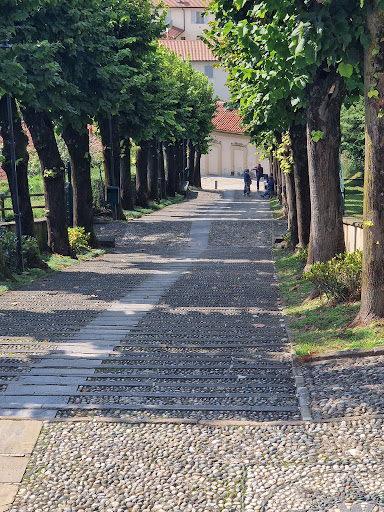 Dal fianco meridionale della Villa Agnesi sale la fresca scalinata di centottanta gradini fiancheggiata da tigli e ligustro. A circa tre quarti di altezza, la âscala santaâ è intersecata da un ampio sentiero pianeggiante, che circonda tutta la cima della collina alla base del complesso architettonico, in forma di anello. Questo sentiero è detto popolarmente âVia Crucisâ perchĂŠ delimitato, sul perimetro esterno, da vetusti cipressi e da sedici edicole in pietra arenaria, contenenti altrettante sculture settecentesche ad altorilievo, che riproducono le scene tradizionali della Via Crucis, realizzate a cura del parroco Giuseppe Antonio Villa.