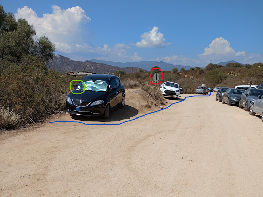 Read morePer chi ama la natura, è una spiaggia paesaggisticamente molto bella e caratteristica. Noi ci siamo arrivati da nord, abbiamo costeggiato lo stagno Feraxi e dopo un po' ci si immette in una strada sterrata. Il problema è il parcheggio, in quanto si può posteggiare solo da un lato, mentre sull'altro lato vige il divieto di sosta e state pur certi che se sosterete l'auto in divieto, troverete un'ammenda, come ne ho viste in tutte le auto in divieto( nella foto è cerchiata l'auto con l'ammenda e la zona in divieto). L'alternativa è la salita che conduce al sentiero che poi arriva in spiaggia, però la salita è ripida ed è solcata da profonde buche alte anche 30 cm, quindi consiglio di provare con un 4x4, o prestare molta attenzione. Percorsa la salita, si arriva al sentiero che conduce alla spiaggia. Il panorama dall'alto è spettacolare, mentre lo è meno l'accesso al sentiero, inizialmente molto sconnesso, non adatto a tutti, considerando che ci si porta dietro ombrellone e borse. La fatica per il posteggio e il sentiero è ripagata dalla spiaggia, adatta a chi ama la natura perché priva di lidi con lettini e ombrelloni, non c'è nemmeno un chiosco o uno chalet. A perer mio, ne vale la pena...