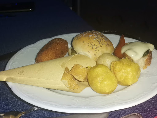 Buffet insufficiente, pizzette e panzerotti surgelati, patatine e noccioline da busta. Primi piatti molto semplici, ma comunque rimangono un po' pesanti. Idem per il cocktail di benvenuto, che non mi è piaciuto molto.