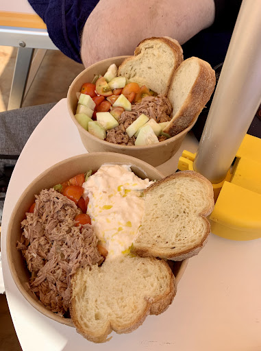 Passiamo al pranzo... premesso che è vietato portarsi cibo dall'esterno, anche giustamente, passiamo alla loro proposta: su un menù di 12 portate semplici, disponibili solo 3 (2 tipo di frise e 1 tipo di insalate) quelle più accattivanti e quelle che in effetti avrebbero fatto la differenza ( sulla fiducia naturalmente) non disponibili perché il pesce fresco a fine stagione non lo prendono (5 settembre??) i piatti caldi privi di pesce poi non si capisce come mai non erano disponibili.