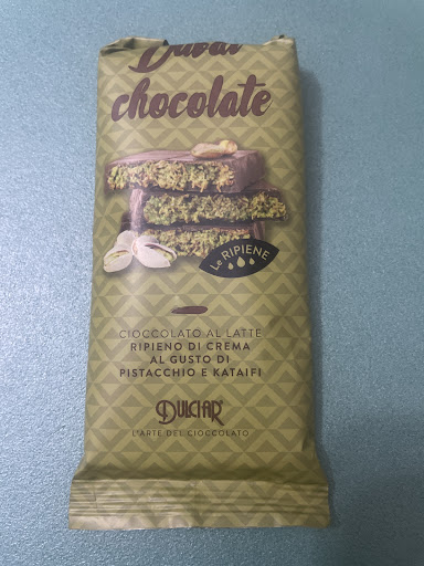 Ho acquistato una barretta di cioccolato Dulciar “A Dubai Chocolate”, attratto dalla descrizione accattivante sulla confezione che prometteva un ripieno di pistacchio e kataifi. Purtroppo, l’esperienza è stata estremamente deludente: all’interno non c’è alcuna traccia del ripieno indicato, solo semplice cioccolato bianco.