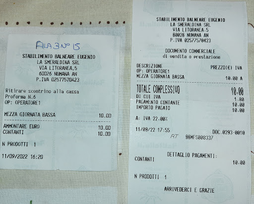 Brutta esperienza quella vissuta in questo bagno oggi (ieri, a dire il vero, è trascorsa la mezzanotte) e mi auguro proprio che il gestore mi contatti, perché non sono rimasto affatto soddisfatto! Arrivo alle 16:15 per parlare con Samuele, gestore del ristorante omonimo "Eugenio" lì accanto, che conosce la mia famiglia e da cui volevo fermarmi una sera a cena e quindi prenotare. Fatto questo, gli chiedo se posso fermarmi per il resto del pomeriggio in spiaggia e lui mi indirizza verso la piccola casetta all'ingresso del bagno. Chiedo di poter restare solo un'ora ma la giovane ragazza lì presente mi fa notare che le tariffe sono rigide e il biglietto per lettino e ombrellone è quello per la "mezza giornata bassa stagione" dal costo di €10. Non le viene neanche per sogno l'idea di informarmi con un prezioso consiglio che forse non sarebbe stato il caso di entrare, visto che dopo un'ora il sole sarebbe tramontato. Bagno penalizzato, questo, anche per la sfavorevole conformazione geologica della piccola altura al di là della strada che, in quel punto, è ancora più alta e quindi copre il sole ancora prima al tramonto. La ragazza fa il suo interesse, naturalmente! Pago e mi viene consegnato lo scontrino che vedete a sinistra in foto e, solo per caso, in spiaggia leggo che non ha alcun valore fiscale, è CARTACCIA, e che devo ritirare lo scontrino alla cassa. MA IO MI TROVAVO GIÀ IN CASSA QUANDO AVEVO PAGATO!!! Una strana modalità di operare, mi dico. Quando dopo un'ora, a sole tramontato, vado a chiedere della possibilità di rimanere un'altra ora in spiaggia un giorno successivo, la ragazza continua a ripetere rigidamente che le tariffe sono impostate dalla regione, fa finta di non capire. Per quanto riguarda lo scontrino fiscale... incredibile!! Non l'aveva fatto al momento del pagamento e scende dalle nuvole quando glielo chiedo, adducendo il fatto che "è nuova". Me lo fa al momento (foto a destra). Dal momento che penso che le persone che se ne accorgano siano veramente poche (io tra quelle), mi viene da pensare che questa giovane ragazza alla cassa sia appositamente istruita nel non rilasciare alcun documento fiscale, se non su precisare richiesta. Trovo questo comportamento decisamente sgradevole per non dire altro. Due giorni dopo mi trovavo presso la Caserma della Guardia di Finanza di Osimo per fare un esposto.