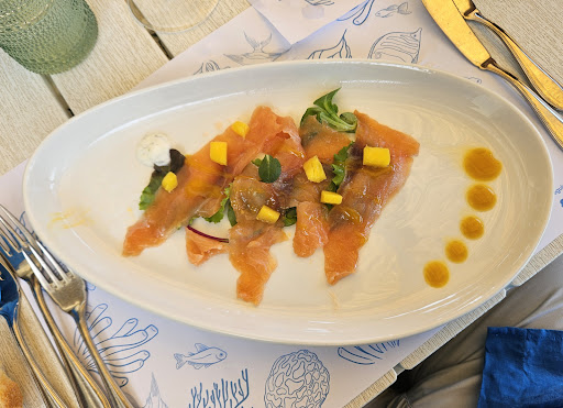 Recensisco il solo servizio ristorante. Io e la mia compagna, dietro suggerimento, siamo capitati li in una mattinata uggiosa e fresca di giugno (unica, in mezzo ad un periodo caldissimo). Erano le 11.30 e la titolare era indecisa se aprire/chiudere, data l'assenza totale di persone (per il meteo). Il cameriere, molto cordialmente, ci ha detto che ci avrebbe pensato lui, predisponendo per altro sia un tavolo al coperto che uno all'aperto. Dopo un'ora ci siamo ripresentati per il pranzo. Il cameriere, sempre con grande disponibilità, cordialità, simpatia e professionalità apprezzabili, ci ha consigliato i piatti disponibili. Abbiamo optato per due insalatine (con 4 gamberi surgelati cadauna... lo ha detto lui stesso), un primo con frutti di mare, un fritto misto, una bottiglia di acqua e due calici di pecorino. Eravamo solo noi, vista mare, serviti continuamente... bell'atmosfera. Piatti di discreta qualità (di quelli "belli da vedere, normali da mangiare) e quantità sufficiente per un locale "non trattoria". Essendo il compleanno della mia compagna, nonché gli unici clienti del giorno, oltre alle coccole verbali, il cameriere ci ha promesso un trattamento di favore (ripetendo più volte "io voglio coccolare i miei clienti e voglio che ci tornino"). Finito il mio calice, me lo ha riempito nuovamente, dicendo "dai, al compleanno, con la frittura da mangiare, non puoi stare senza". Sembrava un calice "offerto"... invece, poco dopo, sempre con "fare amichevole", ci ha fatto capire che ormai conveniva prendere la bottiglia (18 euro, come i 3 calici)... Ok 🤷♂️ Abbiamo chiuso con un tiramisù in due. La "sorpresa" é arrivata al momento di pagare: 90 euro! senza menù, senza scontrino, senza dettagli. Certo... anche fessi noi a non protestare subito... ma dovevamo metterci a litigare in quel contesto (compleanno)?? Insomma... ci é parso davvero eccessivo, considerando tutto. Ah... il cameriere é juventino (a buon...