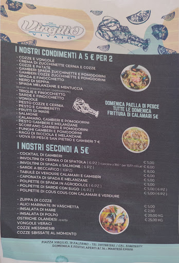 Oggi ho avuto una piacevole esperienza al Vivaio Virgilio. Premetto che ieri ho telefonato per chiedere se eventualmente oggi avrei trovato delle aragoste e il Sig. Toni mi ha risposto che non avevano la disponibilità ma avrei potuto trovare degli astici nostrani. Ho detto che gli avrei potuto prenotare gli astici solo questa mattina (vigilia di Pasqua) tra le 9 e le 9,30 e mi ha risposto che poteva aspettare fino alle 9,30. Stamattina ho telefonato entro le 9,30 e il Sig. Toni mi ha detto che potevo andare a ritirarli. Mi ha fatto trovare due bei astici nostrani di cui uno pieno di uova fantastiche che domani al pranzo di Pasqua spalmero' sul pane tostato mentre con i due astici prepareremo una bella minestra di astice con pasta fresca. Non è la prima volta che mi trovo bene al Vivaio Virgilio, ottimo posto dove acquistare cozze, vongole, frutti di mare e tanti bei Condimenti a base di pesce. Ottime le polpette di sarde e i calamari fritti e tanto altro tutto di buona qualità. Complimenti al titolare ed al personale....