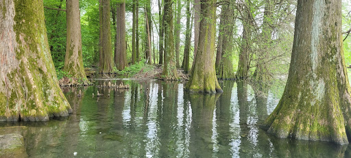 Il vero gioiello di questo bosco sono gli alberi Taxodium distichum, noti anche come cipressi calvi, che dominano il paesaggio con la loro maestosa presenza.