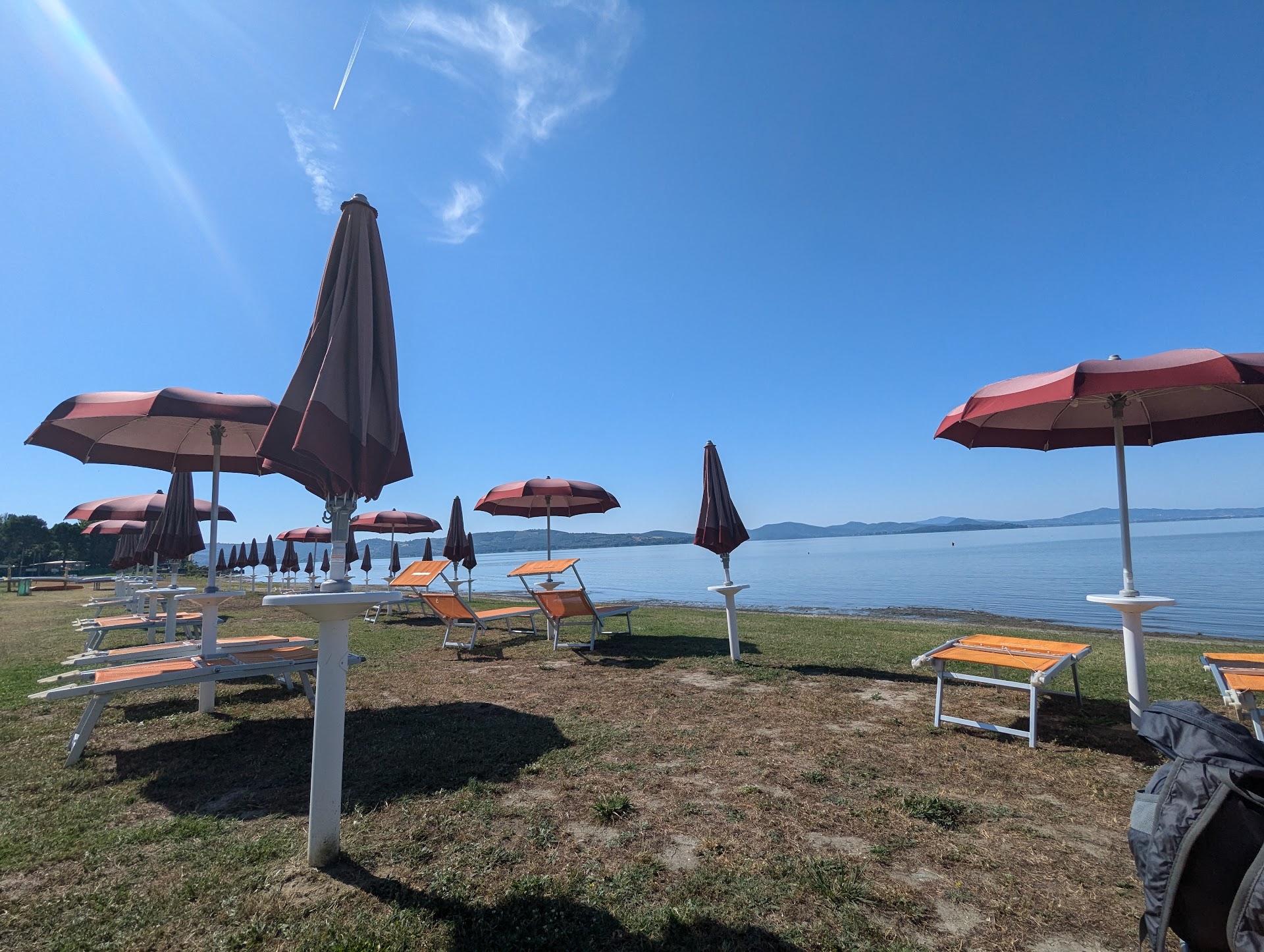 Read moreThe beach isn’t a 5* resort on a seaside but fair enough for the lake for those want not drive 3 hours to the nearest sea near Pisa. The beach itself is free to access and swim, bar with food/drink is fair. 2 sun bed with umbrella is 15 Eur for a day. Small part of the beach is sand covered. The lake is like a live water - not crystal clear but is good. For those would like to enjoy a cleaner and chemically treated water the small pool is available for an additional 2,5 Eur/person. Fair choice on a cost...