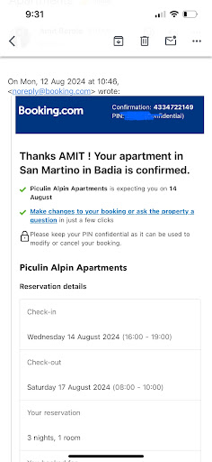 We had terrible experience at Piculin Apartments. Our booking was confirmed for the date 14th August 24 and even we received the booking and check in confirmation same day. Upon arrival on ,we met one lady there she was not aware about our booking, She called another lady and I was informed by her that the apartment I had booked was not available. and she offered another apartment in a different hotel, Kolfuschgerhof Mountain Resort&Spa in a Corvara. This substitution was not communicated to me prior to my arrival we went to Corvara and initially he lady didn't show up in fact the another ladies on the reception started to do the check in process with put mentioning anything, we asked to see the apartment first offered alternative apartment was on a basement level with no view, at all after asking if they have another room with a view she offered us a room without kitchen for 1200 €, we told that this is our out of budget room then she price down same room to 900 € , It was still out of budget for us so at the end she offered us same room in 650 €, we felt like we have beed scammed with fake booking...