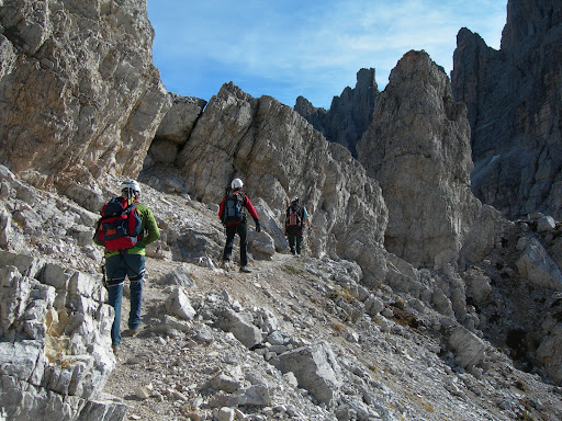 A popular via ferrata in The Tre Cime Nature Park which is named after two friends who found themselves on the opposing sides in WW1 and both died on this mountain. The trail to the ferrata starts at Rifugio Tre Cime southbound towards Monte Paterno. One first climbs a normal path, then enters the steep and low-ceiled tunnel called Gallerie del Paterno. The ferrata starts at the end of the tunnel. The ascent is steep and somewhat exposed but not at all technically difficult. I would rate it as B/C level. The distance from the tunnel to the peak is 600 meters and it took my group about 1 hour to cover it. The important downside of this ferrata is it's popularity - it is suitable for beginners and thus crowded in season so that waiting every now and then is inevitable. As the surrounding scenery is beautiful, waiting time can be shortened by taking great pictures... The descend is to the south...