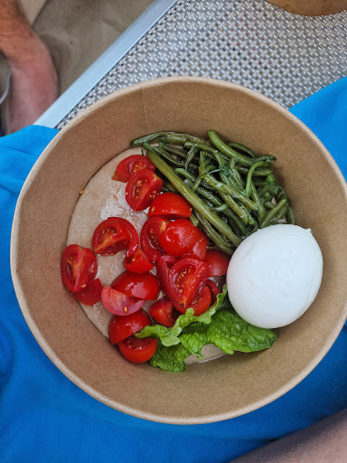 Read moreAbbiamo prenotato una postazione tramite il sito,due lettini un ombrellone a 32 euro. Arrivati una signora gentilissima ha consegnato braccialetto con cauzione di 10 euro per le doccia, restituita. La nostra postazione era infondo, e chi si trovava al banco non aveva ben chiaro quale fosse la postazione però il bagnino subito ci ha portato alla postazione. Spiaggia pulita Il problema sovviene a pranzo, intanto nel sito c'è un menu totalmente differente da quello che poi realmente è presente nel bar/ristorante. Costi davvero alti. Alle 12 e 55 volevamo pagare insalata scelta ma c'è stato comunicato che la cucina apriva alle 13 quindi scontrino dopo le 13. Alle 13 ordiniamo due insalate, ripeto menu anche un po ridotto soprattutto se asporto in quanto tavoli già al completo. Attendiamo in nostro turno e vediamo che il cameriere che gestisce le comande d asporto verifica le ordinazioni,quindo non gli sfugge completamente la quantità che c'è all interno, consegna gentilmente in un sacchetto, ci rendiamo conto arrivati alla postazione la quantita davvero ridicolo per quanto abbiamo pagato. Insalata tricolore 16 euro, ho fatto la foto e tenete conto che mezzo contenitore era vuoto, ho spostato il pomodoro pensando che era un po di più. Credo che sia improponibile un insalata di queste quantità inoltre il ragazzo ha visto le nostre ordinazioni quindi ha anche visto le quantità,parliamo di pomodore fagiolina e una mozzarella, non sn cifre così esorbitanti da poter giustificare tale costo. Nei giorni successivi alcune persone del posto hanno sconsigliato proprio di mangiare la per questo costo elevato in base alle quantita e qualità. Totale euro con bottiglia d acqua 34 euro. La postazione tutto il giorno è venuta 32. Si consiglia il lido per la posizione ma 0 la cucina. Consiglio? Riadeguate il menù perché se già pago la postazione non posso pagare 34 euro di 10 ciliegini, due foglie di basilico(illusa che era una foglia di lattuga) due mozzarelle e all incirca 40gr...