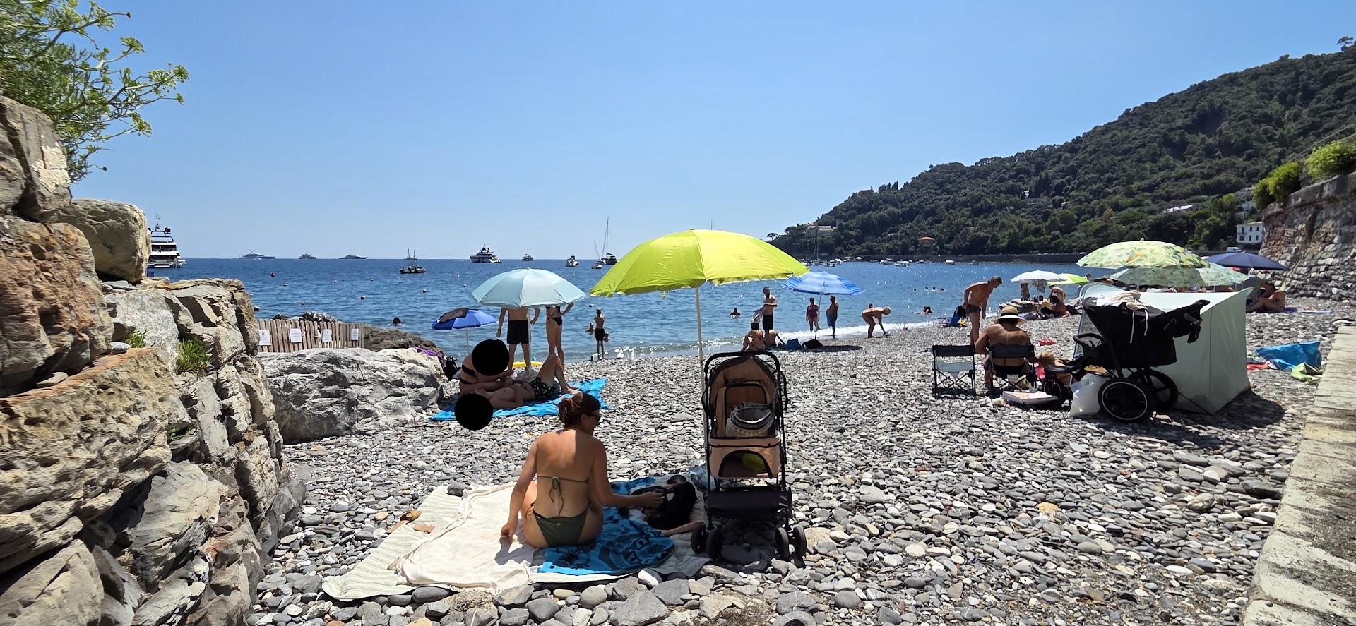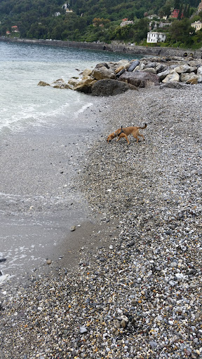 A fair walk outside of town to a rocky beach below the roadway. The canine loved it (excluding the 'scary' rippling waves!), despite the lack of sand. There's a picture of Pluto the Dog with a sign that said "Cani" & "Cancello", which made us a little concerned that dogs were no longer welcome (turns out "cancello" is Ital. for 'gate'. Ah.). The Bau Bau beach sign had fallen off and broken, and half of it was reattached crudely on the handrail halfway down (so totally useless - you have to have already committed to entering the beach without this info!). :) Very grateful that there is a dog-friendly beach access for SML / Portofino, though, so we'll gladly take what we can get! Otherwise - a pretty crummy beach full of...