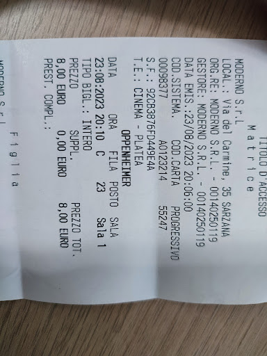 Il Cinema Moderno continua a deludermi a distanza di anni. Dall'uscita del live action Disney del re Leone, avevo deciso di non metterci più piede dopo aver visto i primi 5 minuti del film con le luci accese e con episodi di accensione luci ad intermittenza durante il resto della riproduzione. Decido con l'uscita di Oppenheimer di dargli una seconda possibilità ed è inutile dire che è stata la scelta sbagliata. Dopo una coda lunga, dovuta alla prima serata del film, riusciamo a comprare i biglietti per le 20:06, tranquilli che il film iniziasse alle 20:10: arrivati in sala, luci spente e inizio del film andato... Dopo l'intervallo lo schermo diventa nero e perdiamo un'intera scena del film che poi, una volta risolto il problema, non ci viene fatta recuperare. Ripresa la riproduzione le luci rimangono accese e solo dopo svariate lamentele sono state spente. Ultima scena del film, davvero significativa, accendono la luce, come se ci volessero invitare ad uscire velocemente. Il biglietto, ci è stato fatto pagare a prezzo intero, nonostante fosse mercoledi e ci fosse il prezzo ridotto, perché era un evento speciale: non definirei speciale l'uscita di un film che avviene in tutti i cinema italiani nello stesso giorno. L'avrei definito speciale se e solo se ci fosse stato il cast lì con noi! Ierisera sono andata in un cinema indipendente e mi sono finalmente potuta godere il film con la giusta attenzione che si meritava. Mi sono resa conto ancora di più quanto i disagi provati al moderno avessero reso poca giustizia ad un film straordinario. Insomma se potessi dare 0 stelle lo farei... PS: I cinema indipendenti tra i trailers suggeriscono film meno conosciuti e che è davvero un peccato...