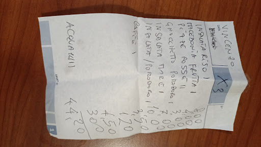 Il posto è carino. Peccato che il servizio lascia a desiderare. Attesa infinita e non c'è possibilità di scelta. Eravamo in tre a pranzo domenica scorsa. Due primi diversi non si possono scegliere perché non si possono fare. Così ci hanno detto. Quindi solo la bambina ha preso il primo e noi ci siamo accontentati di ciò che avevano già pronto come piatto freddo. Scontrini manco se muori!!!! Nel corso della giornata siamo stati una volta per prendere qualcosa come caffè, gelati ecc e poi per pranzo. Crema caffè in tetrapak del supermercato! Cose da non credere!!!! Eppure esistono!!! La prima volta niente scontrino ho pensato vabbè può capitare..... A la certezza l'ho avuta a pranzo.!!!!! Vergognoso. a pranzo praticamente lo scontrino è la comanda!!!! Il signore dietro la cassa scorbutico e con un atteggiamento come per dirmi di non rompere!!! Io l'ho solo guardato incredula. Esterefatta da tutto ciò che vedevo accadere. Non mi è piaciuto affatto questa comportamento maleducato. Una sola signora con la coda e i capelli neri di cui non ricordo il nome si impegnava a servire tra dentro e fuori... Altri due giravano a vuoto senza guardare nulla. .. ambiente per nulla professionale, solo trattati con sufficienza come se ci stessero facendo un favore. Non lo consiglio. Non ci riandrò . Non ci andate. Andate dove emettono ricevute e scontrino fiscale. Allego foto scontrino, anzi noComanda!!!...